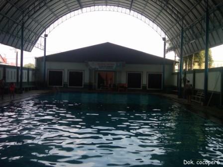Untuk kolamnya ya tidak terlalu besar, tersedia dengan kedalaman 140 cm dan 120 cm. Tidak ada batas area kedalaman, hanya penurunan ubin saja secara perlahan, pembedanya adalah dari warna keramik yang bercorak gelap. Di sekeliling kolam terdapat kursi atau tempat untuk duduk ya alakadarnya saja, nampaknya kurang terawat dengan baik. Kalau dilihat kebersihannya sih memang bersih, cuma seperti ada hal yang kurang, entah itu apa. Kolam renang ini terlindungi dari panas dan hujan karena ada atap kanopinya. Over all sih ya cukuplah, namun ketika dibebankan dengan harga yang sama Rp 15.000,00 rasanya cukup mahal. Pembanding saja di Grage Hotel hanya Rp 10.000,00.